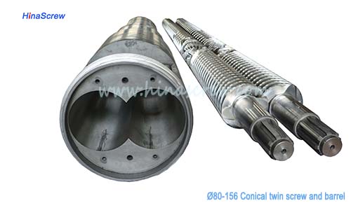 (HinaMach, Zhoushan, China, 10-11-2021)Conical twin screws and barrel for CMT58 ...